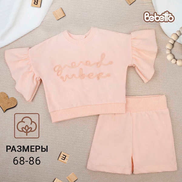Комплект Bebetto футболка с объемными рукавами с надписью и шорты персикового цвета