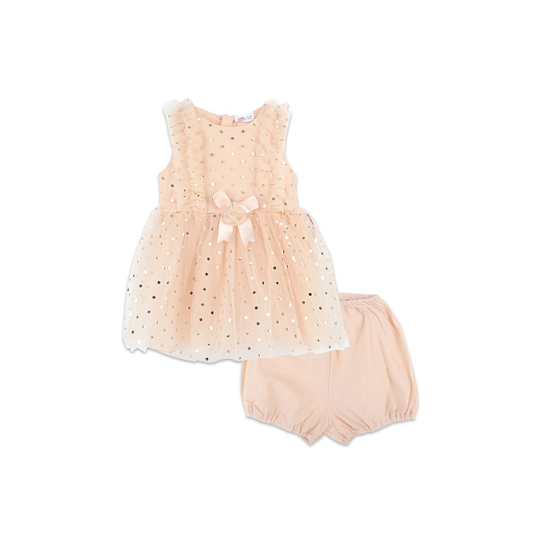 Комплект, состоящий из платья, шорт и повязки на голову, станет отличным дополнением в гардеробе вашей маленькой принцессы. Нежно-розовое платье, украшенное блестящими золотистыми горошинами, с розовыми шортиками и повязкой на голову создадут милый образ вашему ребенку.