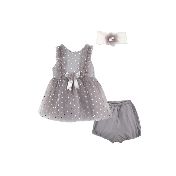 Сделать из малышки сказочную принцессу легко с помощью нарядного комплекта. Набор состоит из платья с пышной юбкой, шортиков и мягкой повязки на голову. В основе изделий использован натуральный хлопок. Материал чудесно пропускает воздух и приятно прилегает к телу. Пышная юбка платья выполнена из полупрозрачного тюля и украшена горошком из сверкающего материала. Лиф платья украшен рюшами, а поясок дополнен бантом. Завершает образ маленькой леди нарядная белая повязка с бусинами и цветком из тюли. В таком наряде малышка покорит гостей на празднике! Рекомендовано для детей ясельного возраста.