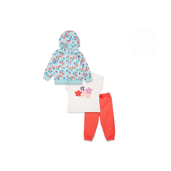 Комфортный и мягкий костюм состоит из свободных брючек, футболки и толстовки с капюшоном на разъемной молнии. Это чудесное решение для летнего сезона, привлекающее внимание сочным сочетанием цветов. Модель предназначена для девочки. Фуфайка украшена цветочным рисунком, который гармонично перекликается с цветовой гаммой остальных элементов комплекта. Для пошива использован мягкий и приятный на ощупь трикотаж, в составе которого 100% хлопок. Такой материал чудесно пропускает воздух, легко стирается, не линяет, быстро сохнет. Одежда долгое время сохраняет привлекательный внешний вид, безопасна для детского организма. рекомендовано для детей ясельного возраста.