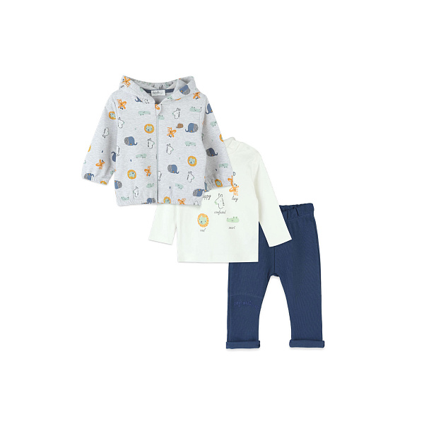 Для прогулок на улице ранней осенью или поздней весной малышам до года подойдет трикотажный комплект, состоящий из толстовки, фуфайки и брюк.