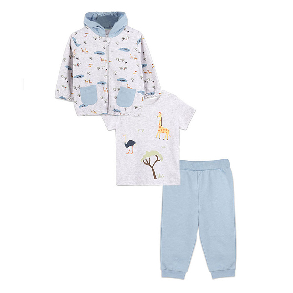 Брюки голубого цвета комфортно сидят по фигуре, не стесняя движений. Серая футболка с коротким рукавом украшена изображениями животных и растений. Удобная толстовка с капюшоном застегивается на молнию, что ускоряет сборы на прогулку. Два накладных кармана на толстовке пригодятся для складывания полезных мелочей.