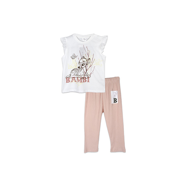 Одежда имеет свободный, не стесняющий движений крой. В такой одежде ребенок может бегать, играть, гулять, не испытывая никаких неудобств. Фуфайка - белого цвета, без рукавов, на груди принт с изображением олененка Бэмби. Лосины на резиночке легко надеваются, хорошо держатся на талии. Цвет – бежевый. Комплект можно использовать для повседневной носки.