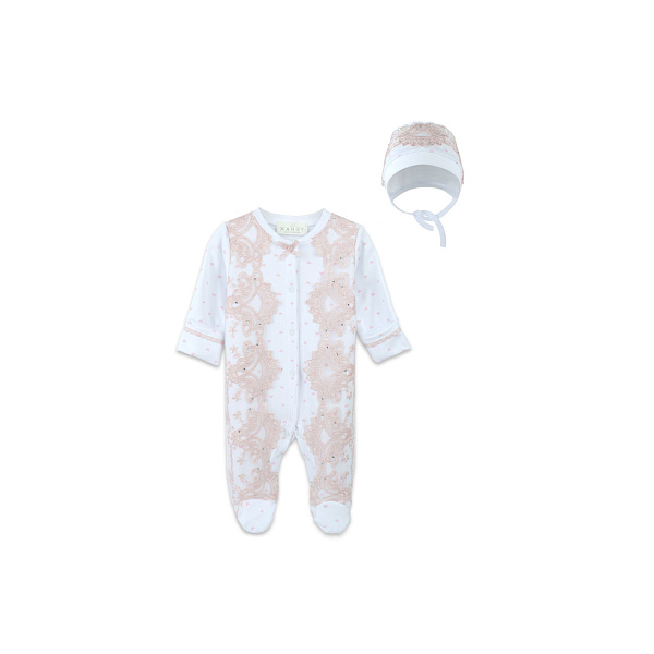 Комплект для новорожденного ЖАНЕТ боди и чепчик принт сердечки с кружевом и стразами белый