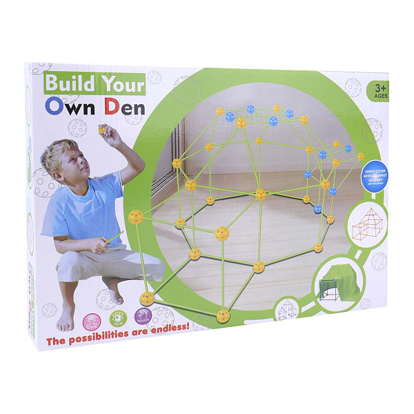 Элементы изготовлены из легкого и прочного пластика, что обеспечивает безопасность и долговечность конструкции. Ребенок может самостоятельно придумать и построить уникальную основу, улучшая логическое мышление и навыки конструирования. Для завершения палатки достаточно накрыть конструкцию любым подходящим пледом или простыней.