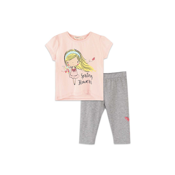 Комплект состоит из серых леггинсов и джемпера с коротким рукавом, на котором изображена милая девочка. Материал, из которого сделан комплект — 95% хлопок и 5% эластан, за счет чего одежда приятная на ощупь и практичная в использовании.