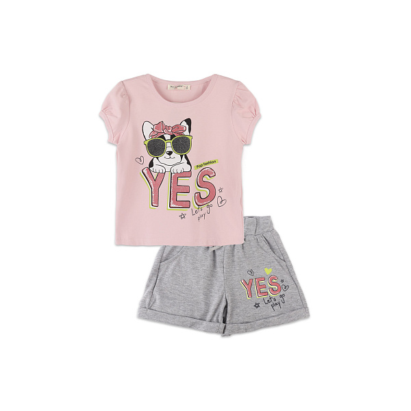 Стильный и удобный комплект состоит из серых шорт и розовой футболки с милым изображением собачки в очках и с бантиком.