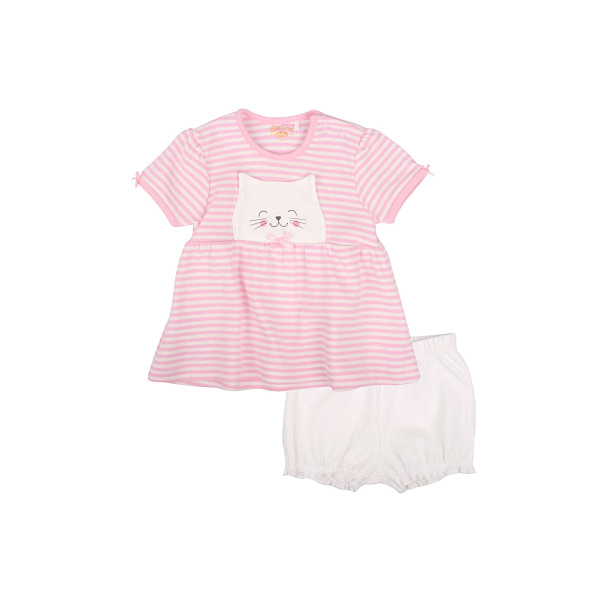 Одежда изготовлена из стопроцентного хлопка. Мягкий трикотаж приятно тянется и не вызывает дискомфорта у ребенка. Благодаря белым штанишкам-трусикам малышка всегда будет выглядеть аккуратно даже в подгузнике. Верхнее розовое платье с коротким рукавом не мнется, хорошо регулирует температуру. Широкий термо-рисунок в виде головы котенка на груди защитит платье от пятен на самом видном месте.
