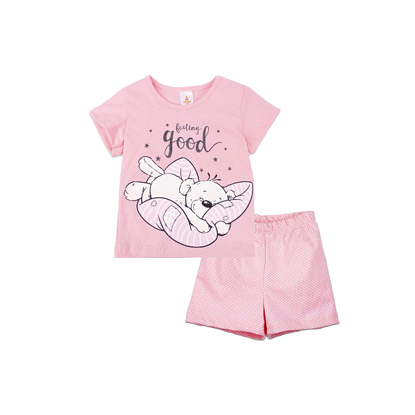 Комплект изготовлен их хлопковой ткани, которая хорошо «дышит» и не парит кожу: в ней не жарко и не холодно. Цвет комплекта – розовый, на кофте имеется принт с изображением спящего на перине медведя. В этой симпатичной одежде можно гулять по парку, ходить по пляжу, играть на природе или на даче. Она будет актуальна в любой ситуации.