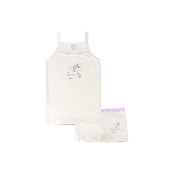 Комплект состоит из майки на бретельках и шортиков с изображением единорога. Оба предмета выполнены в белом цвете и украшены принтом с единорогами. Майка имеет удобную посадку на плечах, а эластичные бретели не давят и не вызывают дискомфорта. Шорты с широкой резинкой на талии, которая не впивается в кожу и не оставляет следов после ношения. Плоские швы не вызывают раздражения кожи.