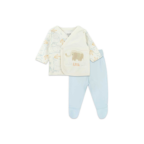 Комплект для мальчика, состоящий из распашонки и ползунков, сшит из мягкой хлопковой ткани. Вещи из хлопкового трикотажа имеют немало преимуществ: они приятны на ощупь, быстро высыхают после стирки и практически не мнутся. Удобная распашонка светлого цвета с рисунком в виде слоников и растений, которая застегивается на кнопки, облегчает для мамы и малыша сборы на прогулку или обычное переодевание. Специальные подвороты на рукавах используются в качестве варежек-антицарапок. Ползунки со ступней, сшитые из однотонной светло-бирюзовой ткани, имеют более комфортные для нежной детской кожи швы, которые не доставляют дискомфорта.