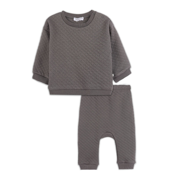 Комплект состоит из свободной кофты с длинным рукавом и штанишек. Он станет основой гардероба маленького мальчика независимо от времени года. Костюм обеспечит комфорт и свободу движений, не будет отвлекать малыша от отдыха и активных игр. Фактурная поверхность придает изделию стильный внешний вид, не требует дополнительного декора. Кнопки на плече позволяют легко переодеть ребенка.