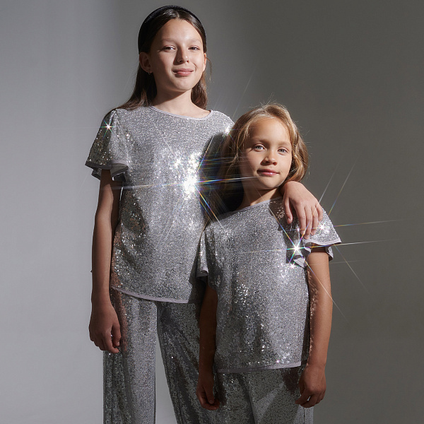 Нарядный блестящий костюм — идеальное решение для создания яркого и запоминающегося образа на любом праздничном мероприятии. В комплект входят широкие брюки и блузка с коротким рукавом, украшенные мелкими серебристыми пайетками.