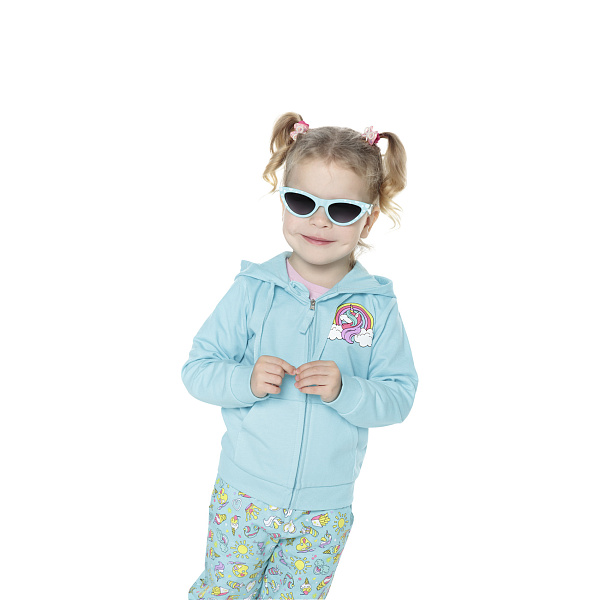 Спортивный костюм из натурального 100% хлопкового трикотажа подойдет для девочек ясельного возраста. Натуральный хлопок в составе материала обеспечивает уход за детской кожей и защиту от неприятных погодных факторов. Брюки с ярким принтом дополнены манжетами по нижнему краю и широкой эластичной вставкой с кулиской по верхнему. На передней поверхности симметрично расположены два прорезных кармана. Однотонная толстовка с прочной центральной застежкой-молнией, капюшоном с регулировкой и декоративной нашивкой-эмблемой гармонично сочетается с брюками. Комплект подойдет для прохладной летней погоды или для ежедневного использования в закрытом помещении.