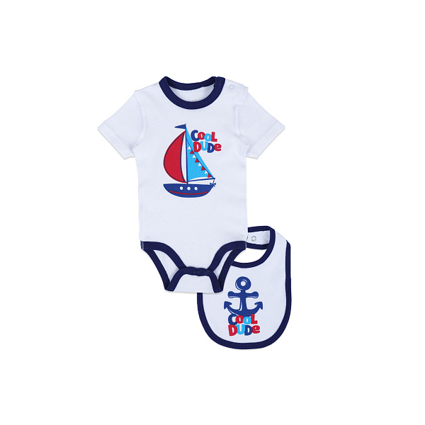 Переживаете о том, как правильно одеть мальчика, чтобы он выглядел стильным, нарядным, и в то же время малышу было комфортно и удобно? Попробуйте боди в комплекте с нагрудником! В данном комплекте используется морская тема – удачный вариант для летней одежды. Вещи сшиты из тянущегося трикотажа, состоящего из хлопка – идеально для чувствительной детской кожи. Все швы на боди прошиты наружу. Короткие рукава защитят плечи ребенка от солнечного света, а две кнопки на плече позволят регулировать диаметр горловины. Боди имеет три надежные кнопки в паховой зоне. Боди и нагрудник выполнены в белом цвете с темно-синей окантовкой. Рисунки на обоих вещах перекликаются: на боди – корабль, на нагруднике – якорь.