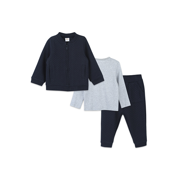 Внесите разнообразие в гардероб малыша с помощью мягкого и комфортного комплекта. В набор входят лонгслив, утепленная кофта и штаны. Штаны и кофты выполнены в едином стиле. Крой кофты свободный и не сковывает движения, по бокам имеются карманы, а по центру – застежка-молния. Низ рукавов дополнен эластичными манжетами, они плотно облегают руки и не пропускают холодный воздух. Штаны облегают ноги, но не мешают активным движениям. Низ штанин с манжетами дополнительно утепляет. Пояс дополнен эластичной резинкой, которая плотно фиксирует изделие на теле. Лонгслив светлого серого цвета в полоску органично сочетается с костюмом. Рукава лонгслива длинные, вырез горловины круглый без воротника, сбоку имеются застежки-кнопки. Такой комплект утеплит ребенка и чудесно подойдет для прогулок в прохладную погоду. Рекомендовано для детей ясельного возраста.
