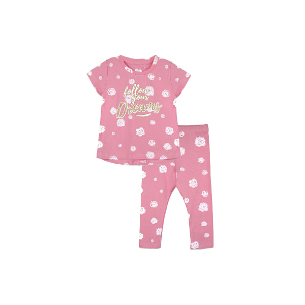 Милый розовый комплект одежды для маленькой модницы. В наборе футболка с коротким рукавом и лосины. Одежда изготовлена из натуральной хлопковой ткани с принтом в виде белых роз и золотой надписью на груди. Весь комплект выглядит очень нежно.