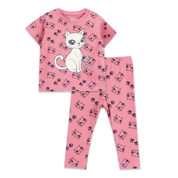 Лосины и футболка сшиты из натуральной хлопковой ткани (в составе хлопок 100%) насыщенного розового цвета с контрастным черным рисунком в виде кошачьих следов и мордочек. Хлопковый трикотаж хорошо пропускает воздух и быстро сохнет после стирки.