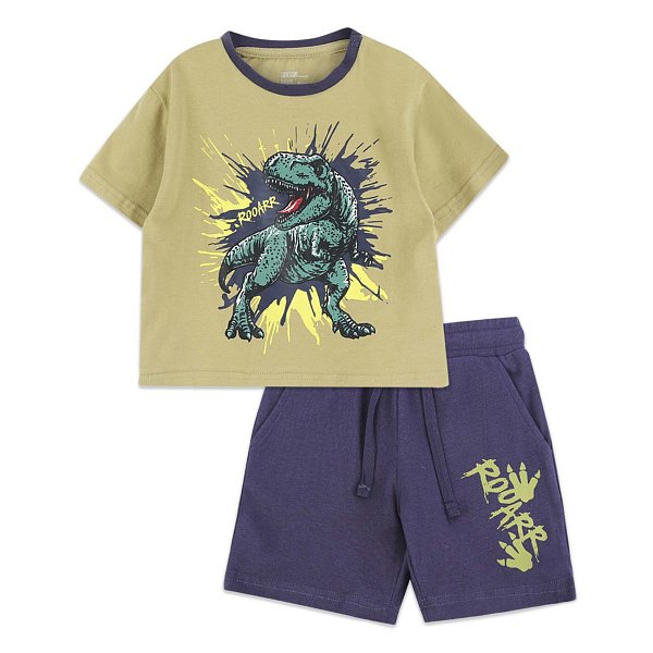 Комплект предназначен для маленького мальчика, полностью соответствует его базовым потребностям. Костюм состоит из футболки с коротким рукавом и шорт на резинке. Для оформления использована практичная цветовая гамма. Изображение динозавра на груди нанесено методом термопечати, продублировано отпечатками его лап на штанине.