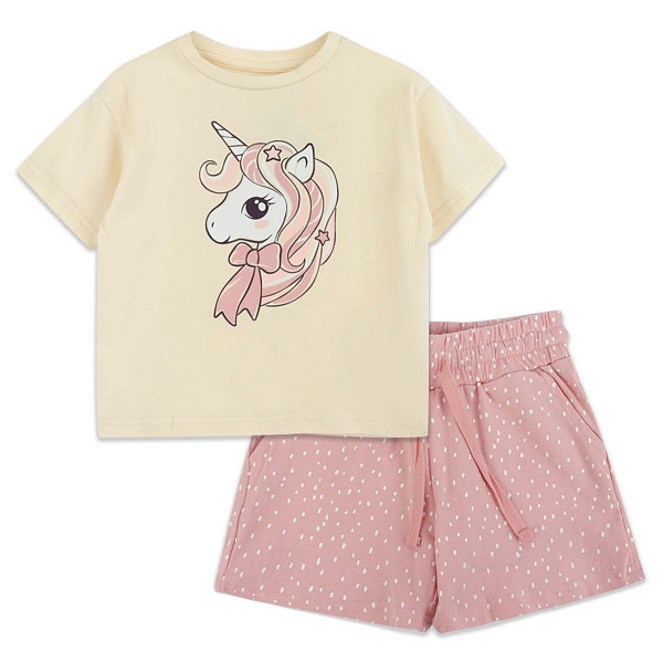 Футболка из ткани светлого оттенка украшена принтом с изображением мордочки единорога. Низ и рукава обработаны фабричным швом, горловина футболки обработана бейкой. Шорты свободного кроя из розовой ткани в белый горошек имеют широкий пояс с кулиской с розовым шнурком, с помощью которого регулировать пояс на талии. Два внутренних кармана пригодятся для игрушек, сладостей и полезных мелочей.