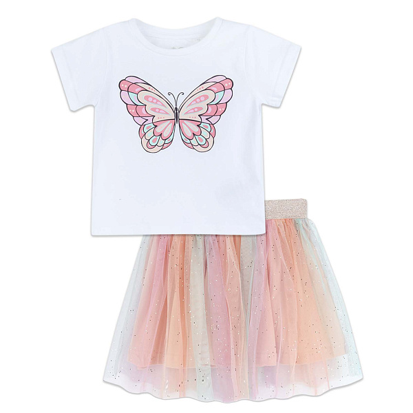 Нарядный комплект с удовольствием будет носить любая девочка. В него входит футболка, украшенная изображением яркой бабочки, и пышная юбка на резинке. Одежда подчеркнет нежный образ юной модницы, не будет сковывать движения. Воображение позволит ребенку почувствовать себя настоящей принцессой, устроить веселую игру.