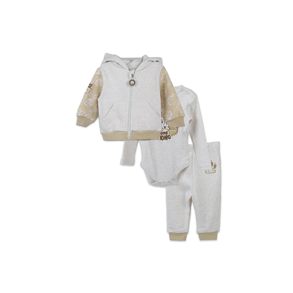 Мягкий и уютный ясельный комплект порадует и родителей, и малышей. В набор входит кофта свободного кроя, боди с длинными рукавами и штаны спортивного стиля. Свободный крой штанов не сковывает движения, а контрастные коричневые манжеты не позволят штанинам задираться. Верх штанов дополнен эластичной резинкой на поясе, а также нашивкой в виде львиной лапы. Детский боди с длинными рукавами, круглой горловиной и застежками-кнопками на вороте и между ножек – благодаря этому малыша можно быстро переодеть и легко сменить подгузник. Центр боди украшает принт льва с надписью «Будущий король». Такой хлопковый комплект согреет ребенка в прохладную погоду и обеспечит естественную вентиляцию. Рекомендовано для детей ясельного возраста.