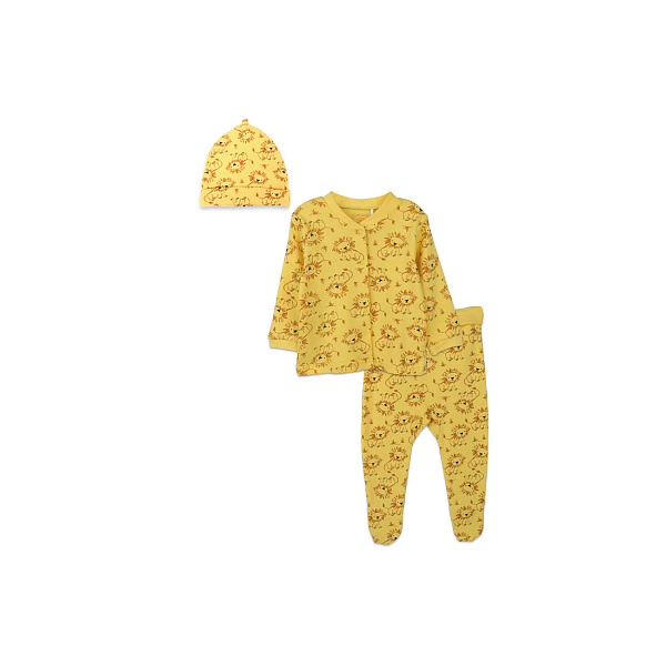 Внесите разнообразие в гардероб малыша с помощью мягкого и комфортного комплекта. В набор входят кофта, ползунки и шапочка. Изделия выполнены в едином дизайне: желтая ткань по всему периметру украшена рисунками львов. Крой кофты и свободный и не сковывает движения, рукава длинные. В качестве застежек использованы кнопки в тон кофте. Ползунки с закрытыми ступнями бережно защитят малыша от холодного воздуха и пыли, пояс дополнен резинкой, которая плотно зафиксирует ползунки на теле. Хлопковая шапочка с отворотом завершает комплект. Рекомендовано для детей ясельного возраста.
