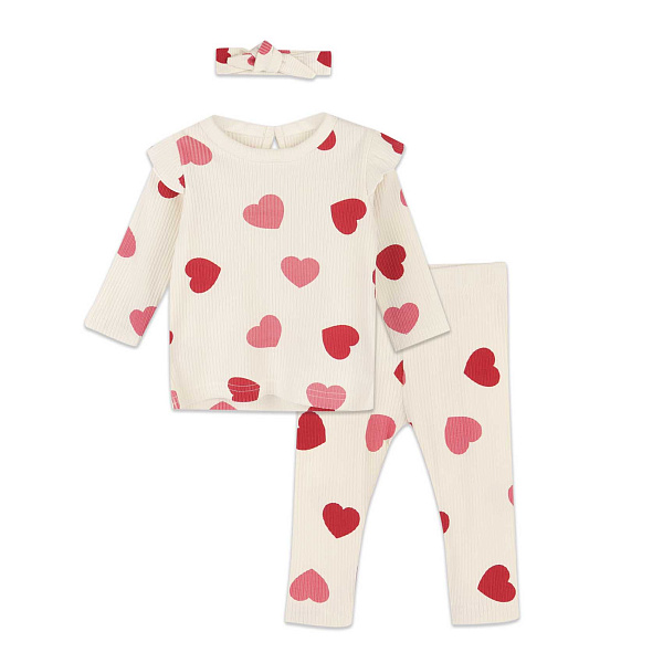 Этот милый комплект одежды выполнен из мягкого и натурального хлопка, что делает его идеальным выбором для самых чувствительных девочек. Ткань не раздражает кожу, не вызывает аллергии, приятно прилегает и не сковывает движений. В комплект входит кофта с длинными рукавами, лосины и повязка на голову. Изделия украшены ярким и жизнерадостным принтом в виде разноцветных сердечек.