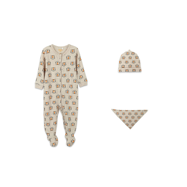 Принт с тиграми делает комплект универсальным как для мальчиков, так и для девочек. Прочная застежка позволяет быстро раздеть или одеть малыша, а также легко сменить подгузник. Комплект из натуральной хлопковой ткани приятно прилегает к коже малыша, хорошо пропускает влагу и воздух, а также сохраняет тепло тела и обеспечивает сухость кожи.