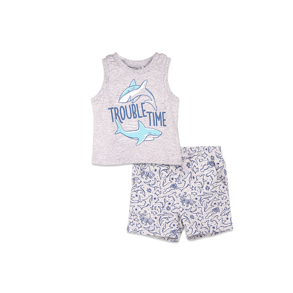 Лаконичный комплект одежды состоит из майки и свободных шорт. В таком наборе каждому ребенку будет комфортно как играть на свежем воздухе, так и спать, используя набор в качестве пижамы. Светло-серая майка украшена ярким принтом опасными акулами и надписью «Trouble Time». Шорты же принтом не только акул, но кальмаров. Благодаря свободному крою одежда не будет сковывать движений, а натуральный хлопок в составе убережет ребенка от появления пота и аллергии.