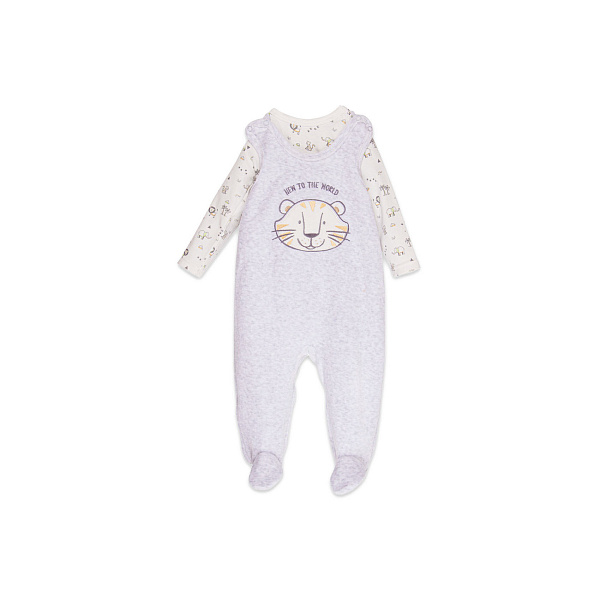 Красочный комплект для малыша из трикотажа включает боди в качестве первого слоя и полукомбинезон в качестве второго слоя. Боди с длинным рукавом белого цвета украшено рисунками тигров, пальм и следов от кошачьих лапок. Застежка на кнопки по линии левого плеча позволяет легко надевать боди на малыша через голову. Застежка между ног предусмотрена для быстрой смены подгузника. Швы выполнены с использованием оверлока. Внешние срезы окантованы косой бейкой. Полукомбинезон выполнен из серого меланжевого трикотажа с красочной надписью и принтом на груди. Застежки на кнопки на обоих плечах позволяют быстро надеть и снять полукомбинезон.