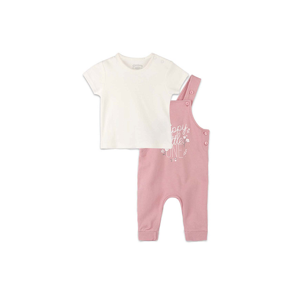 Комплект состоит из розового комбинезона с пуговицами и термопечатью по центру изделия, который дополнен классической белой футболкой. Для удобства ребенка встроены две кнопки на плече, с помощью которых можно расширить горловину при одевании.