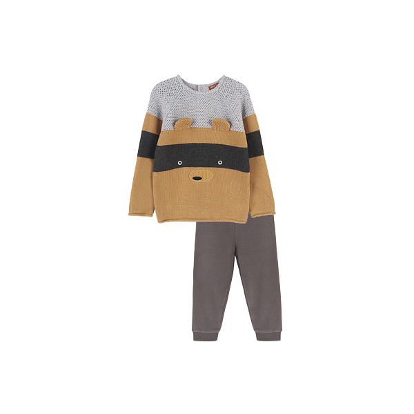 Детский комплект включает свитер и утепленные брючки. Свитерок выполнен в пастельных тонах с аппликациями в виде ушек, глазок и носика мишки. Удачное сочетание оттенков и модный покрой — отличительные качества одежды для детей. Костюм сделан из хлопка с добавлением нейлона. Хорошо сидит по фигуре мальчика любой комплекции, подходит под спортивную обувь. Брюки держатся внизу на резинке, мальчишкам тепло и уютно в костюме, ничто не сковывает их движения. В нем можно пойти на прогулку, надеть в поездку.