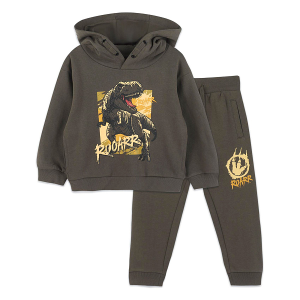Комплект из толстовки с капюшоном и брюк предназначен для мальчика, создан с учетом его основных потребностей. Свободный крой позволит ребенку получить удовольствие от спокойных занятий и подвижных игр. Практичная цветовая гамма удачно дополнена контрастными графическими изображениями. Рисунок грозного динозавра поднимет детям настроение, подтолкнет воображение. Костюм порадует удобными карманами и трикотажными манжетами, мягко прилегающими к телу.