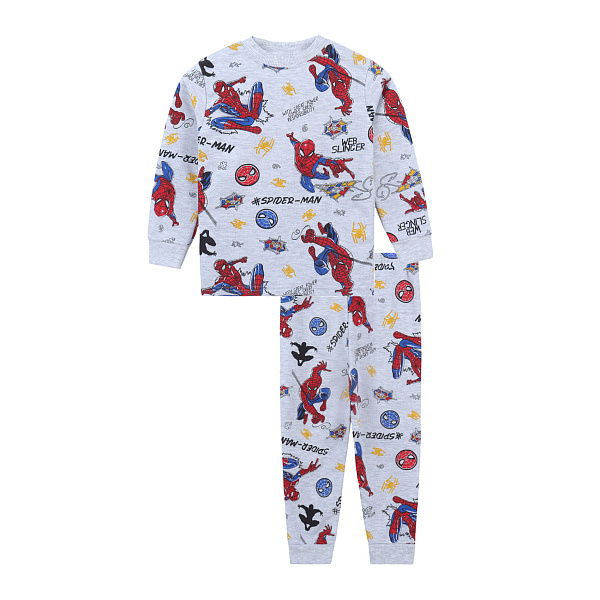 Пижама для мальчиков, состоящая из толстовки и брюк, выполнена из мягкой и эластичной ткани, содержащей хлопка и эластана. Пижама серого цвета украшены ярким и динамичным принтом с изображениями Человека-паука и тематическими надписями, что придает изделию привлекательный и современный вид. Толстовка имеет классический крой с длинными рукавами и манжетами, обеспечивая комфорт и свободу движений. Брюки оснащены эластичным поясом и манжетами на щиколотках, что гарантирует удобную посадку и сохранение тепла.