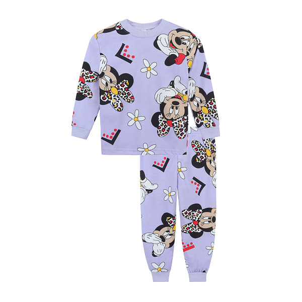 Пижама для девочек, состоящая из толстовки и брюк, выполнена из мягкой и эластичной ткани с комфортной посадкой. Светло-сиреневый цвет пижамы украшен ярким и выразительным принтом с изображениями Минни Маус и цветов, что придает изделиям игривый и привлекательный внешний вид. Толстовка имеет классический крой с длинными рукавами и манжетами, обеспечивая удобство и свободу движений. Брюки оснащены эластичным поясом и манжетами на лодыжках, что гарантирует плотную и комфортную посадку.