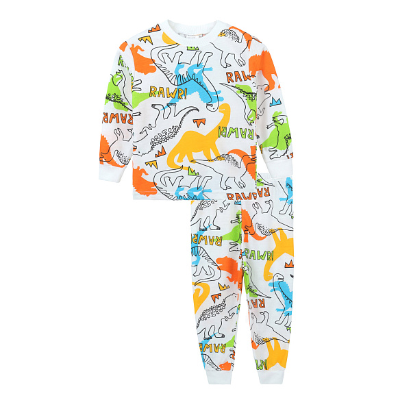 Пижама для мальчиков, состоящая из толстовки и брюк, выполнена из мягкой и эластичной ткани, содержащей хлопок и эластан. Цвет пижамы — белый, украшенный ярким и забавным принтом с изображением разноцветных динозавров и надписей «RAWR!», что придает изделиям игривый и жизнерадостный вид. Толстовка имеет классический крой с длинными рукавами и манжетами, обеспечивая комфорт и свободу движений. Брюки оснащены эластичным поясом и манжетами на щиколотках для удобной посадки и сохранения тепла.