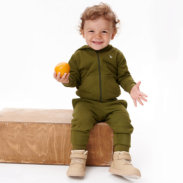 Комплект одежды для маленьких любителей приключений состоит из толстовки и брюк цвета хаки. Толстовка украшена милой вышивкой в виде динозавра, который придает образу оригинальности. Толстовку легко надевать и снимать благодаря застежке-молнии. Карманы спереди добавляют практичности, обеспечивая место для мелочей. Капюшон защитит малыша от ветра и холода.