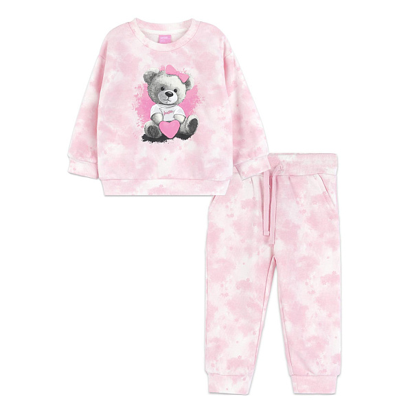 Комплект одежды для маленькой девочки состоит из толстовки и брюк свободного кроя. Он удачно впишется в гардероб юной модницы, будет востребован в теплое время года. Модель привлекает внимание нежной цветовой гаммой и нестандартным оформлением. Фон из абстрактных пятен дополнен миниатюрными цветочками. Основным украшением служит изображение смешного медвежонка на груди. Штаны с парой карманов фиксируются эластичным поясом, не смещаются во время активных игр.