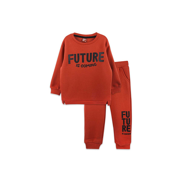 Цвет изделия – кирпичный, толстовка и левая штанина декорированы красивым принтом с надписью Future is coming (будущее приходит).