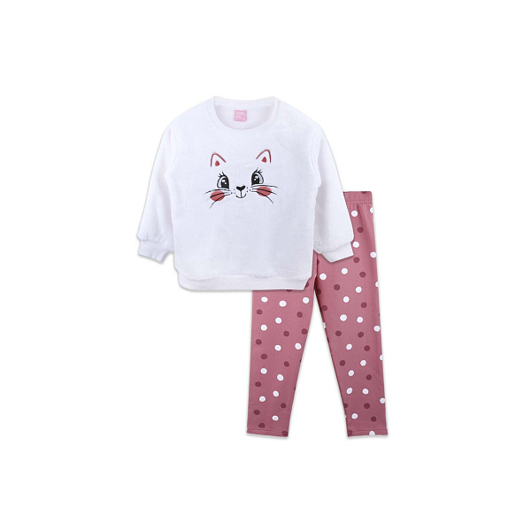 Толстовка имеет свободный крой с длинными рукавами, круглой горловиной и трикотажными манжетами по низу рукавов и самого изделия. Она выполнена в белом цвете, на груди имеется яркий принт, изображающий мордочку кошки. Лосины держатся на мягкой резинке, не сдавливающей живот. Они выполнены в розовом цвет, декорированы черными и белыми горошинами. Сочетание цветов толстовки и лосин создает оригинальный образ маленькой модницы.