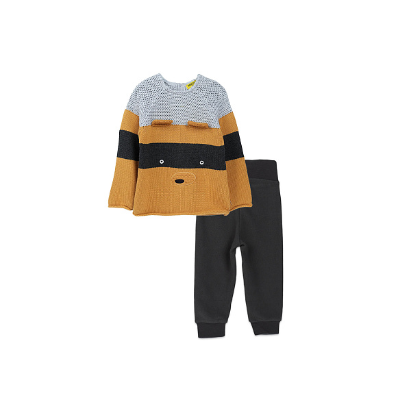 Мягкий комплект займет достойное место в гардеробе ребенка, потому как обладает ярким оригинальным стилем. Он состоит из брючек свободного кроя, которые регулируются по ширине с помощью эластичной поясной резинки. Брюки оторочены широкими манжетами, способствующий сохранению тепла. Также в комплекте есть яркий желтый реглан на утеплителе, с оригинальным оформлением. Изделия подходят для прогулок на улице, сохраняет тепло и способствует максимальному комфорту ребенка. В основе ткани использован натуральный хлопок (для джемпера) и полиэстер (для брюк).
