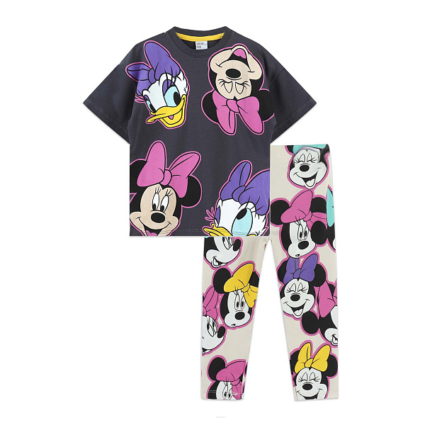 Легкий летний комплект для девочек, состоящий из футболки с коротким рукавом и лосин. Кофта выполнена в сером цвете, а штаны – в бежевом. Оба изделия с крупным рисунком в виде веселых персонажей популярных мультфильмов. Фуфайка свободного кроя. Она комфортно сидит и не стесняет движения. На поясе лосин широкая и мягкая резинка, которая не давит на живот и не мешает кровотоку. Комплект можно носить вместе и по отдельности.