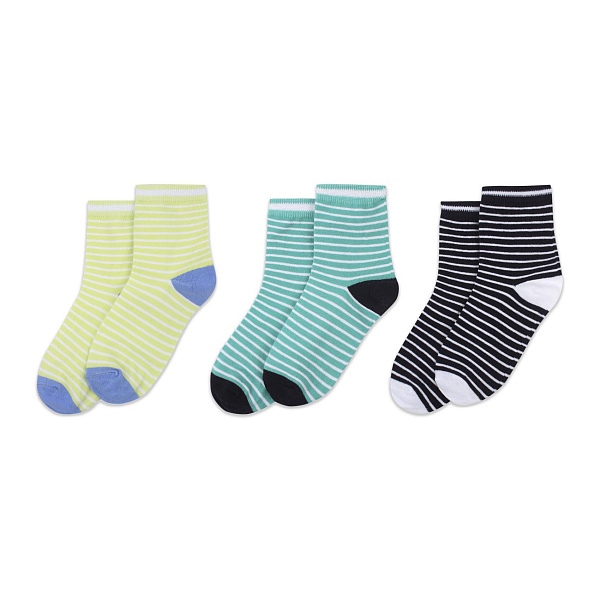 Комплект из трех пар детских носков отличается яркими и веселыми цветовыми сочетаниями в полоску. Носки удобно сидят на ноге и подходят для разных случаев благодаря разнообразию оттенков — от нежного лимонного и бирюзового до классического черного с белым.