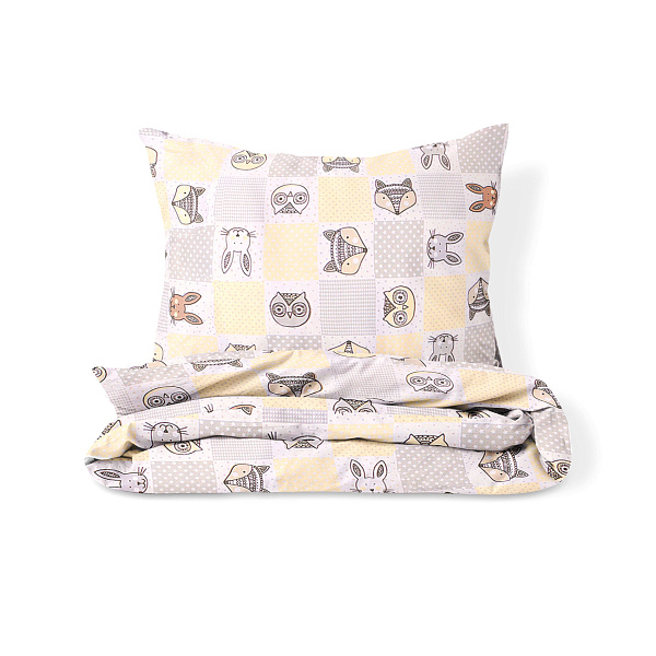 Дизайн постельного белья выполнен в серо-желтых ненавязчивых тонах, которые подойдут для детской комнаты и мальчика, и девочки. Милые зверюшки украшают лоскутки и настраивают малыша на сказочные сновидения.