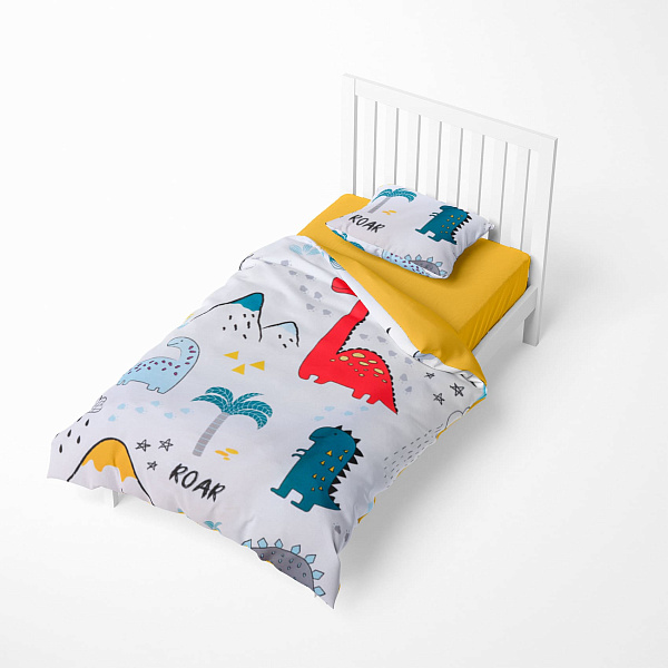 Необычное оформление постельного белья заинтересует детей и подростков. Однотонные элементы насыщенного желтого цвета дополнены стилизованными изображениями динозавров на фоне среды их обитания. Такой дизайн положительно повлияет на детское воображение, поднимет настроение.