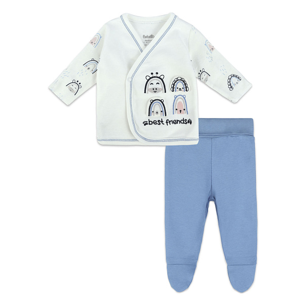 Комплект для мальчика включает в себя распашонку и ползунки. Одежда выполнена в нежных небесных тонах с изящным рисунком в виде милых оригинальных животных. Распашонка белого цвета обрамлена тонкой синей линией, что создает аккуратный и завершенный вид. Ползунки представлены в спокойном голубом цвете с эластичной резинкой на талии для комфортной посадки. Особое внимание уделено материалу изделия — 100% хлопок обеспечивает мягкость коже младенца и позволяет «дышать», избегая раздражений.
