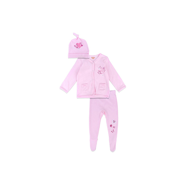 Девочкам полугодовалого возраста будет мягко и комфортно в ясельном комплекте для малышей. В комплект входят кофточка, ползунки и шапочка. Комплект сшит на 100% из натуральной ткани – хлопка. Цвет – светло-розовый. Кофта на застежках-кнопках, в ней два кармана, на груди аппликация – сердечко и бабочки. Шапочка-бини также украшена аппликацией с сердцем и бабочками. Ползунки на резинке с закрытой пяткой, легко надеваются. Материал комплекта мягкий и приятный на ощупь, не вызывает аллергический реакций. Кофта и ползунки достаточно просторные, не стесняют движений. В такой одежде малышу будет тепло и уютно.