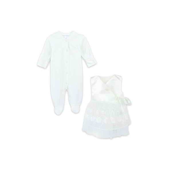 Комплект ЖАНЕТ «Бабочка» белого цвета включает в себя комбинезон с закрытыми ногами и легкое платье-накидку. У платья кружевная юбка, атласный верх без рукавов, который украшает кружевная бабочка. На поясе пришита атласная лента. Комбинезон можно носить отдельно или вместе с платьем, так комплект выглядит более празднично и торжественно.