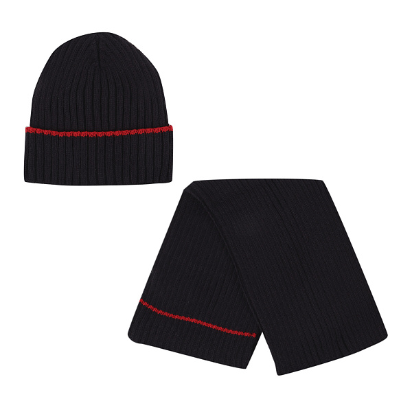 Шапка и шарф имеют лаконичный черный цвет, разбавленный яркой красной полоской, придающей комплекту динамичный и современный вид. Благодаря этому он будет гармонично сочетаться с различными предметами зимнего гардероба ребенка.